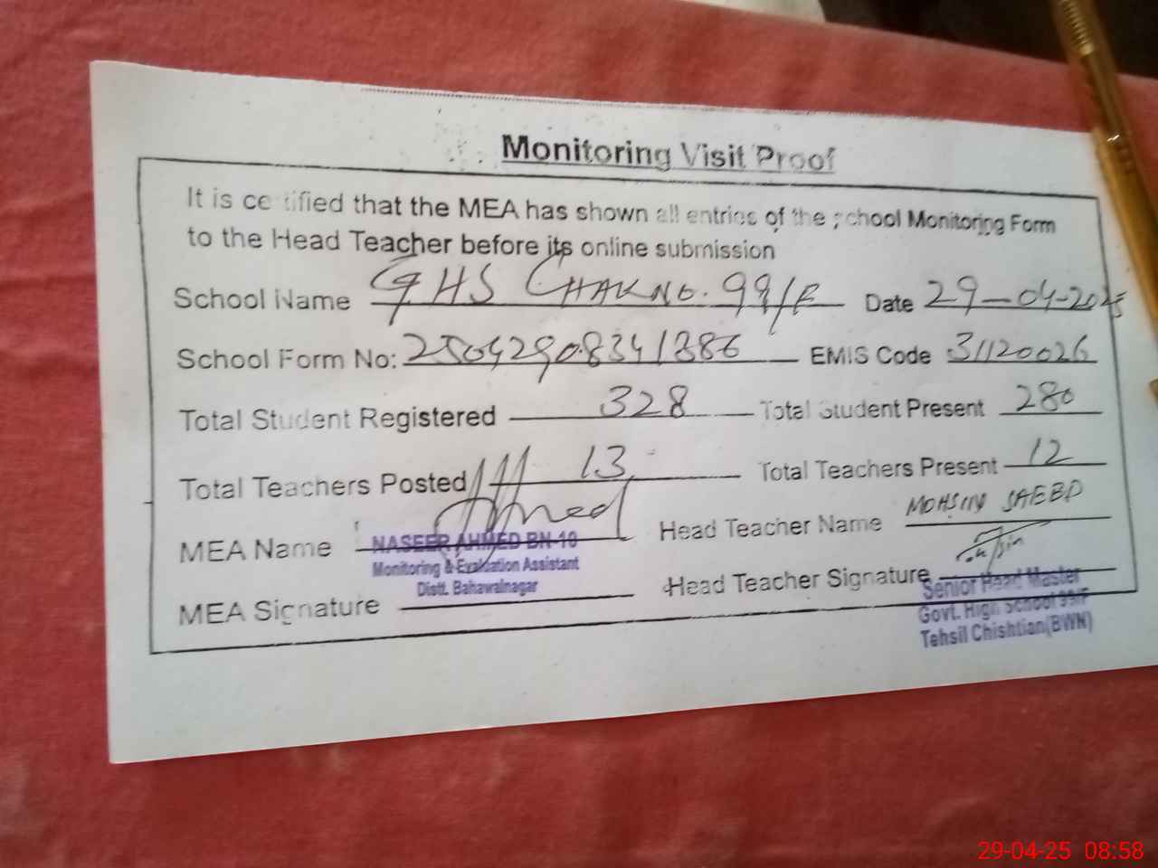 | Attendance Register | Head Teacher | MEA with School | Visit Proof |