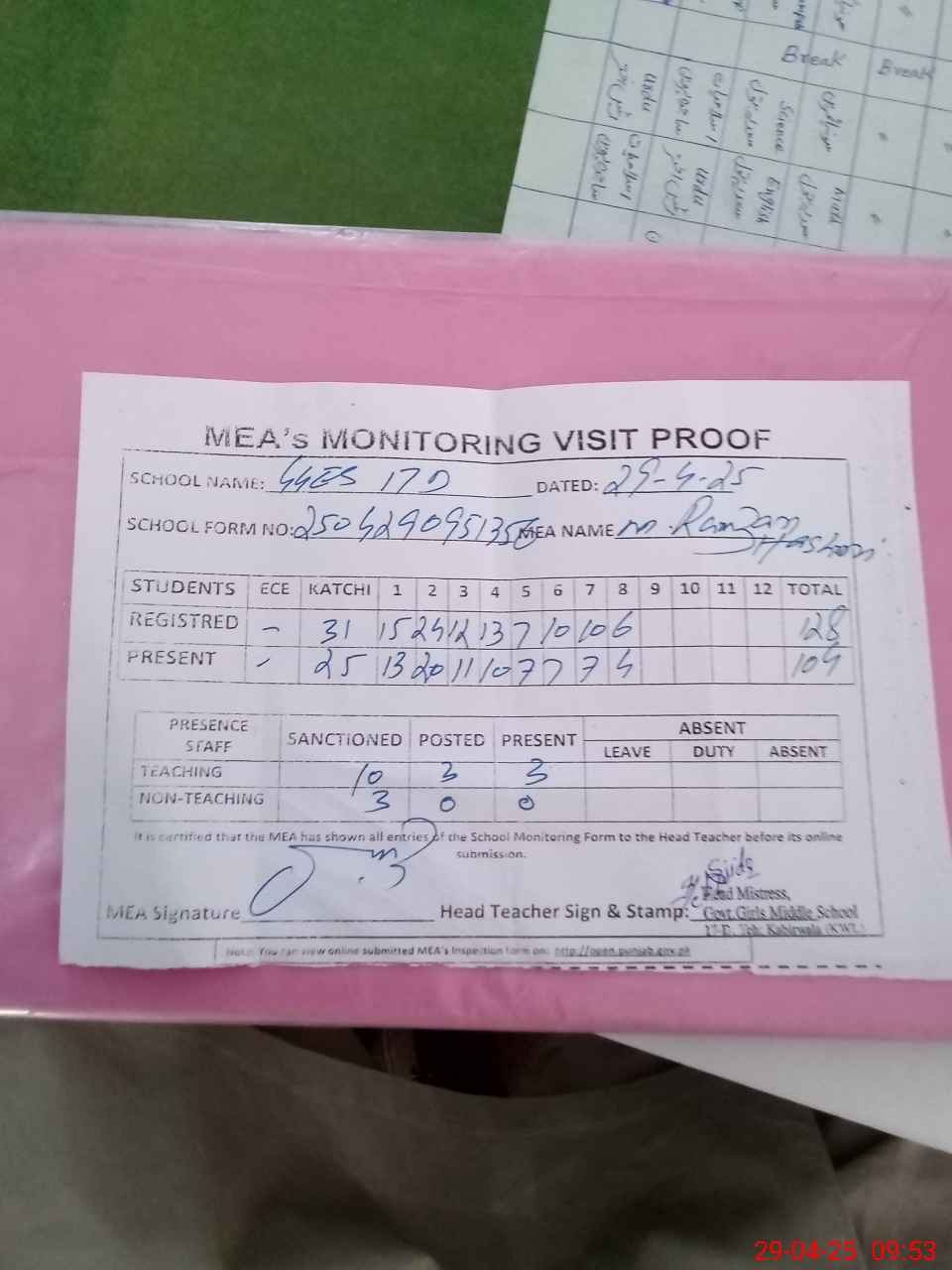 | Attendance Register | Head Teacher | MEA with School | Visit Proof |