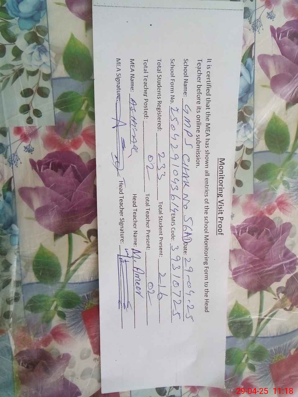 | Attendance Register | Head Teacher | MEA with School | Visit Proof |