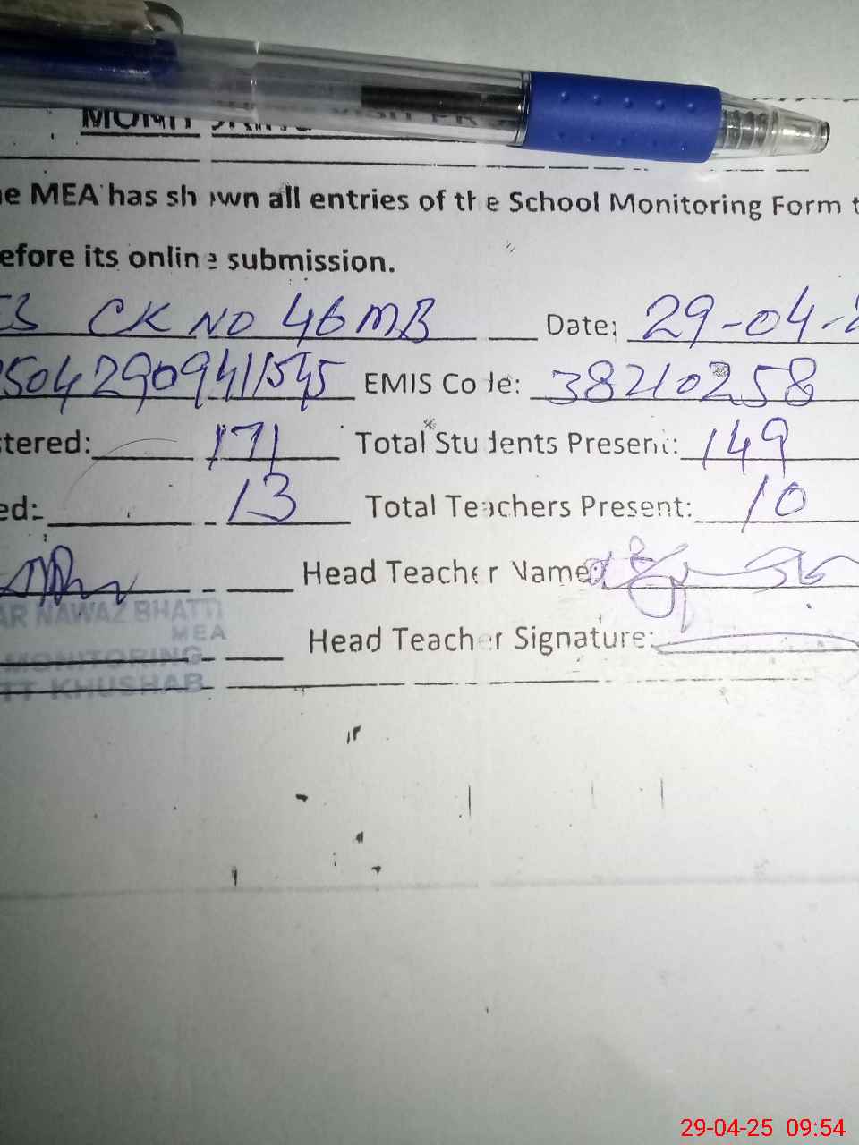 | Attendance Register | Head Teacher | MEA with School | Visit Proof |