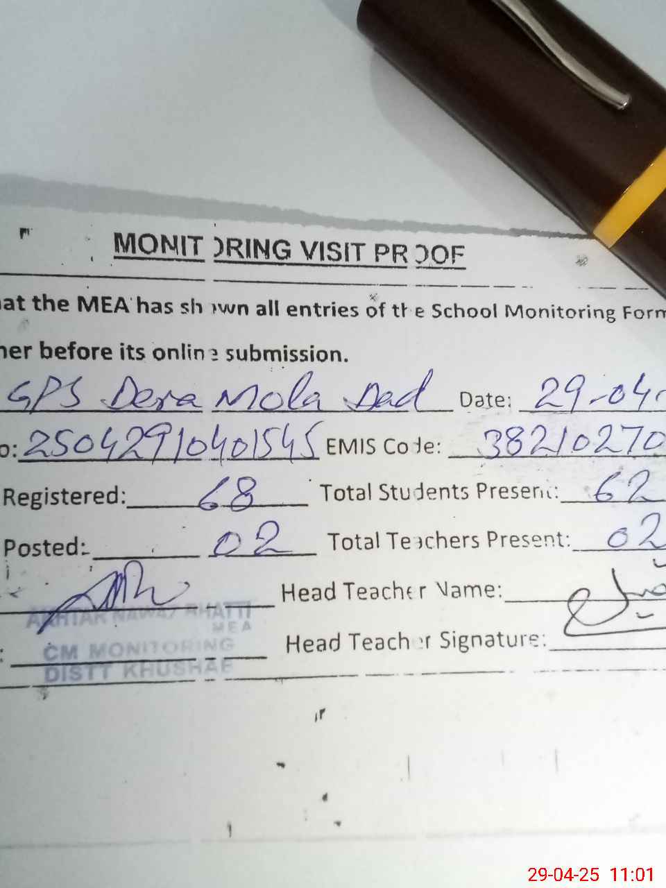 | Attendance Register | Head Teacher | MEA with School | Visit Proof |