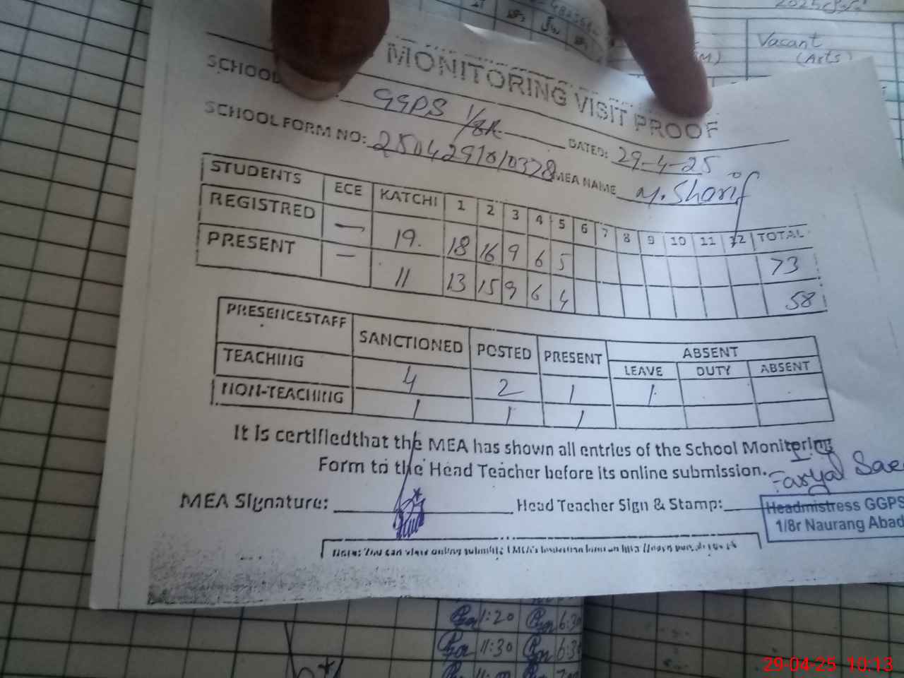 | Attendance Register | Head Teacher | MEA with School | Visit Proof |