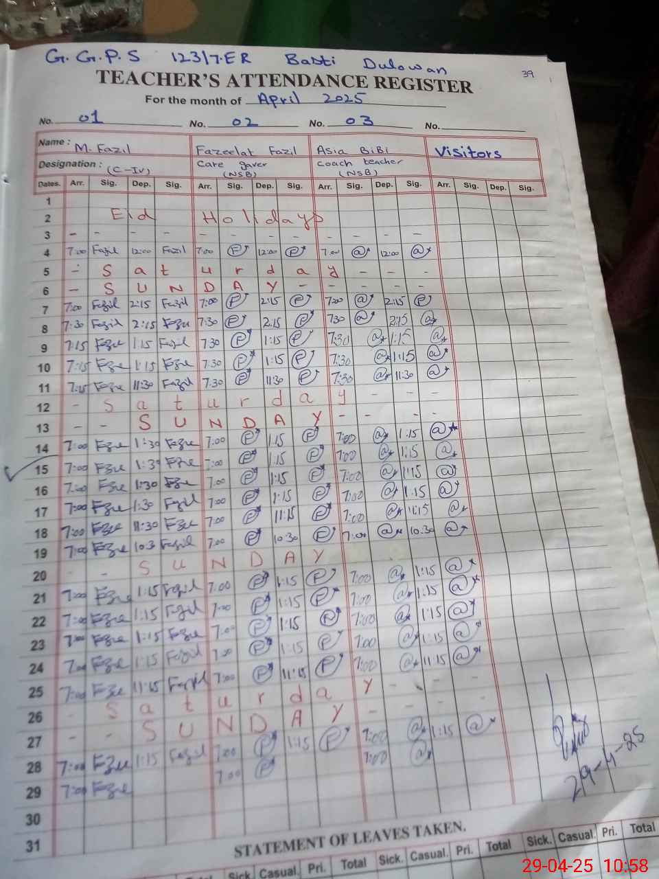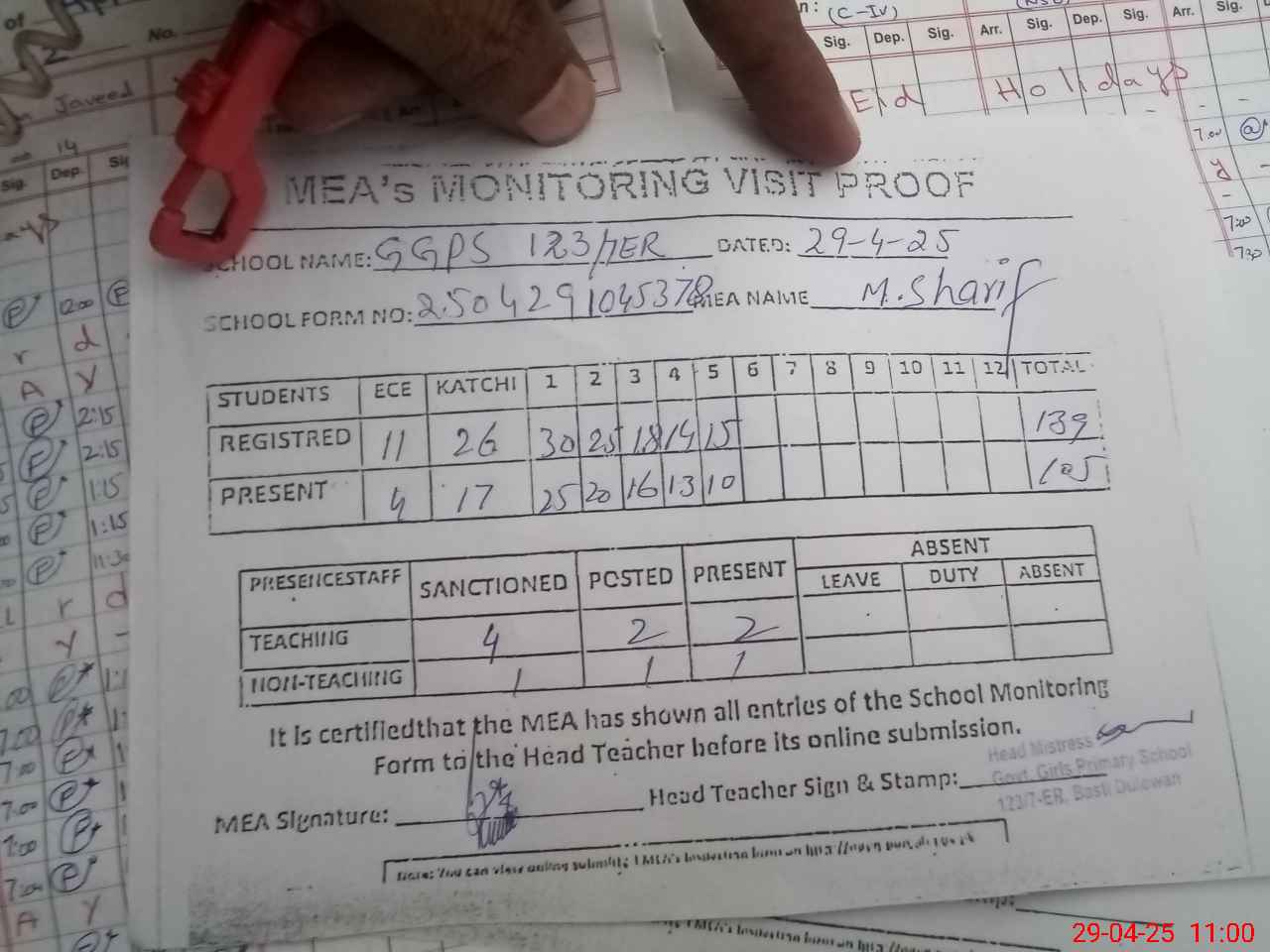 | Attendance Register | Head Teacher | MEA with School | Visit Proof |