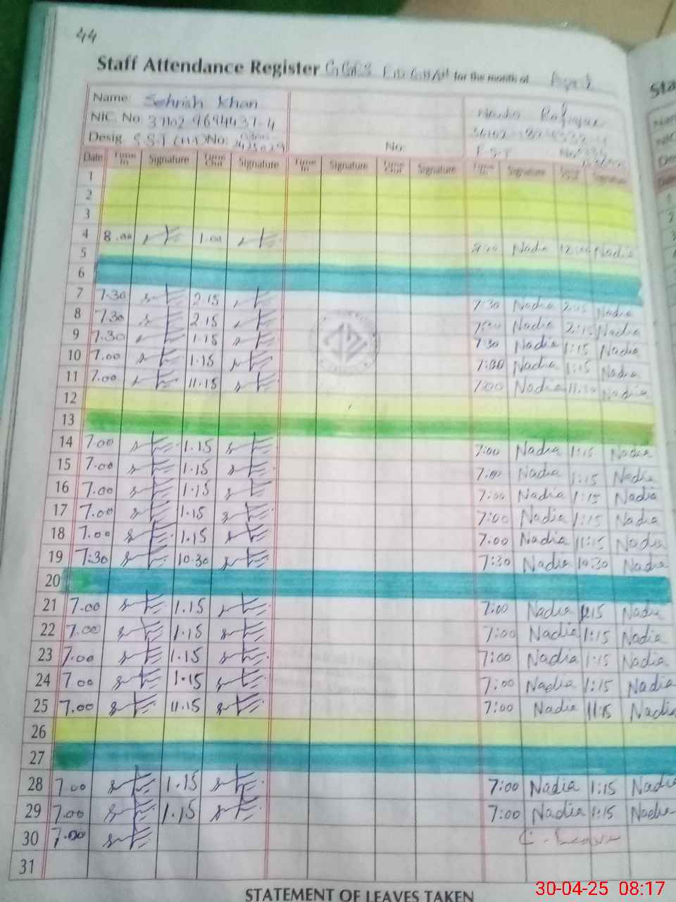 | CNIC | Full Name | Designation | R/C | Absence During Last Calender Month |