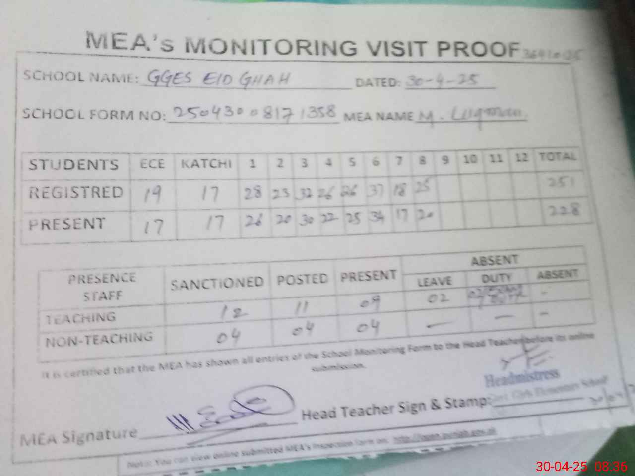 | Attendance Register | Head Teacher | MEA with School | Visit Proof |