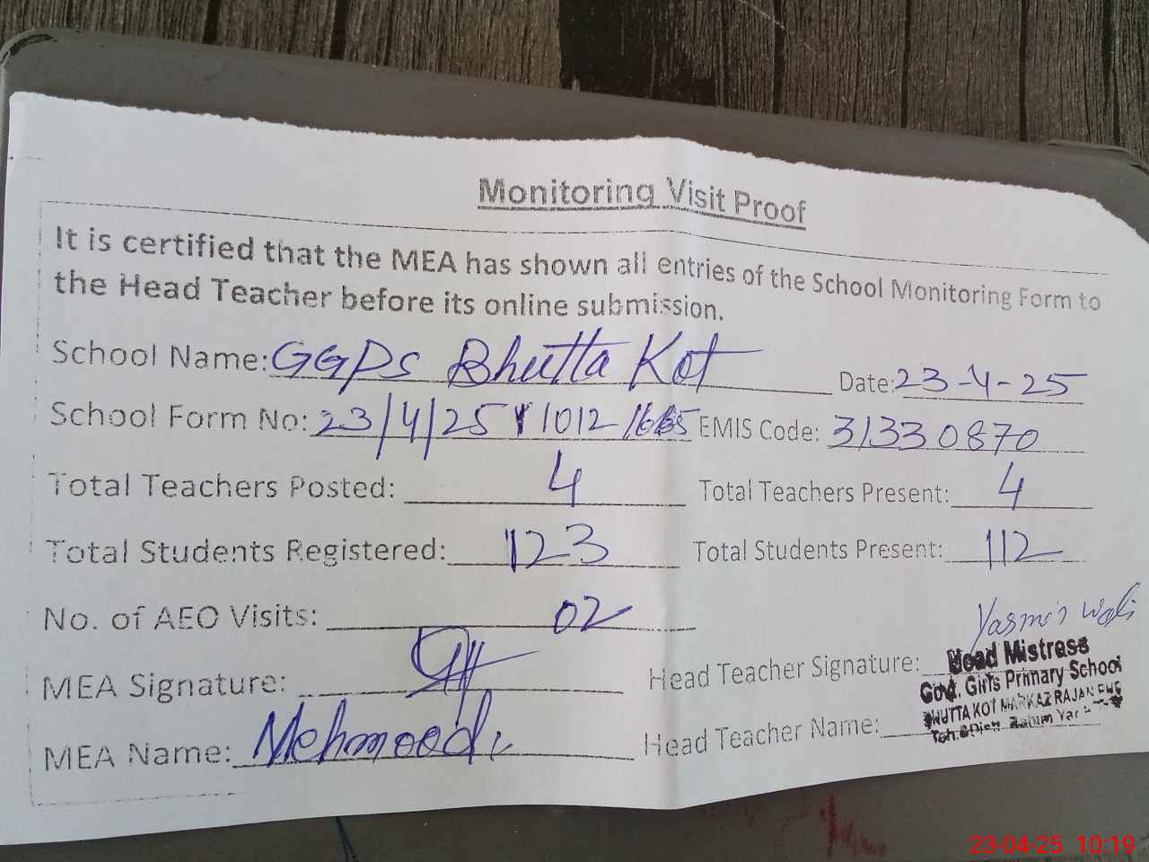 | Attendance Register | Head Teacher | MEA with School | Visit Proof |
