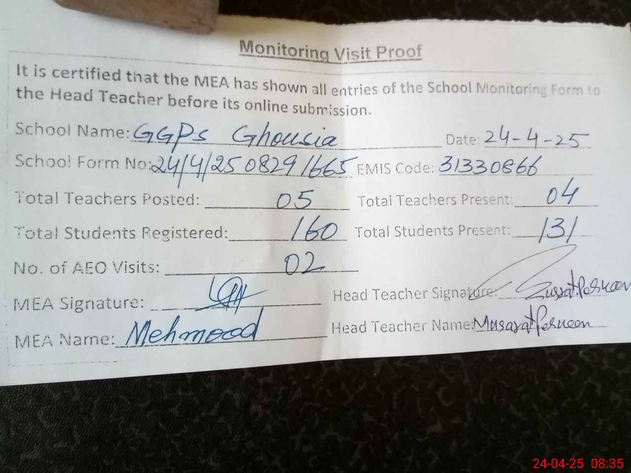 | Attendance Register | Head Teacher | MEA with School | Visit Proof |