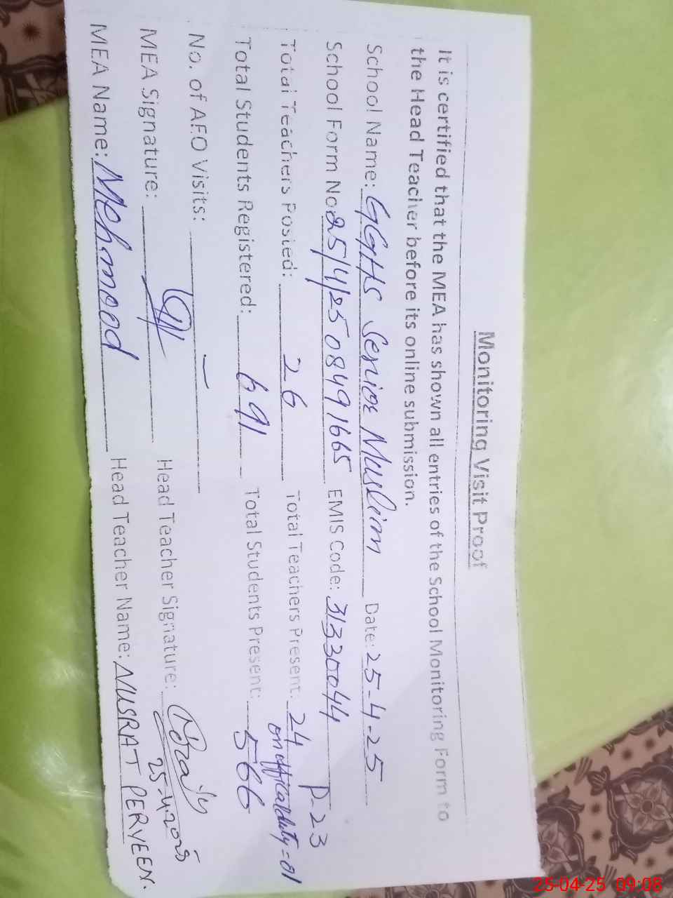| Attendance Register | Head Teacher | MEA with School | Visit Proof |