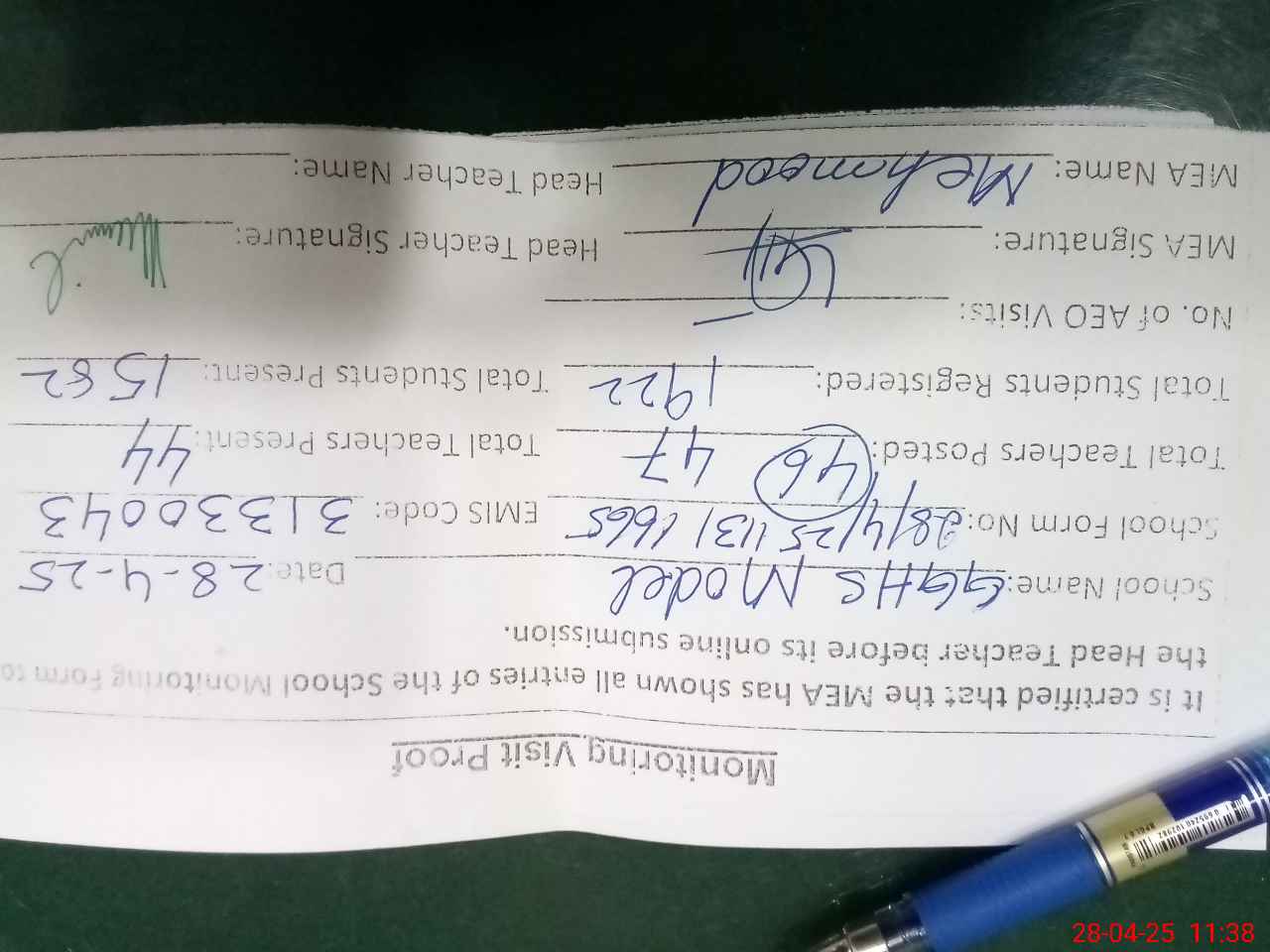| Attendance Register | Head Teacher | MEA with School | Visit Proof |