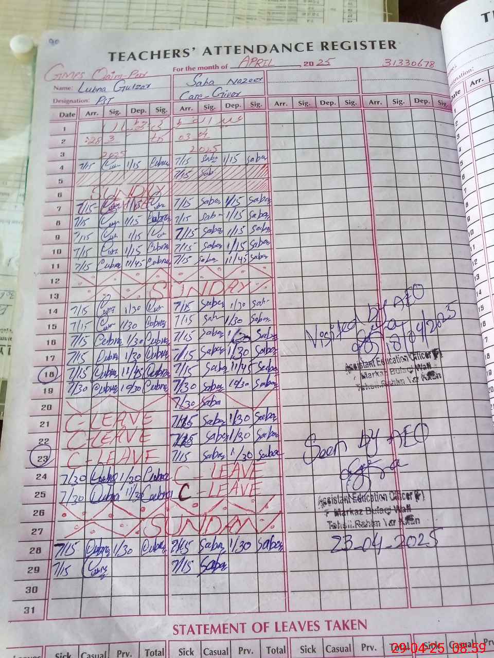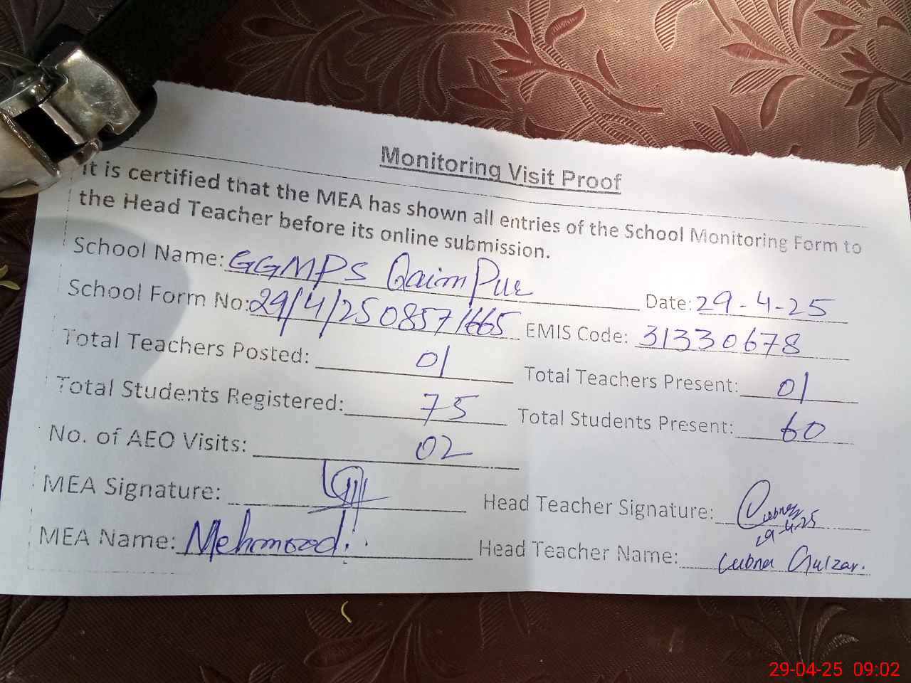 | Attendance Register | Head Teacher | MEA with School | Visit Proof |