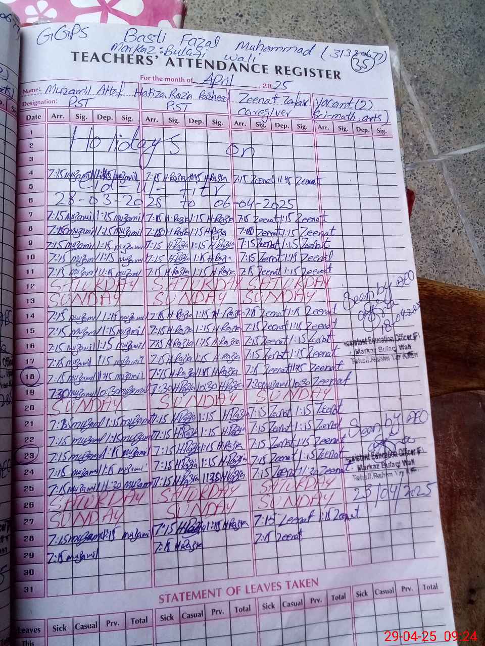 | Monitoring Date: 29-04-2025 | Start Time: 29-04-2025 09:13 AM | End Time: 29-04-2025 09:27 AM | Name of MEA: Ma**** UlHa**** | |