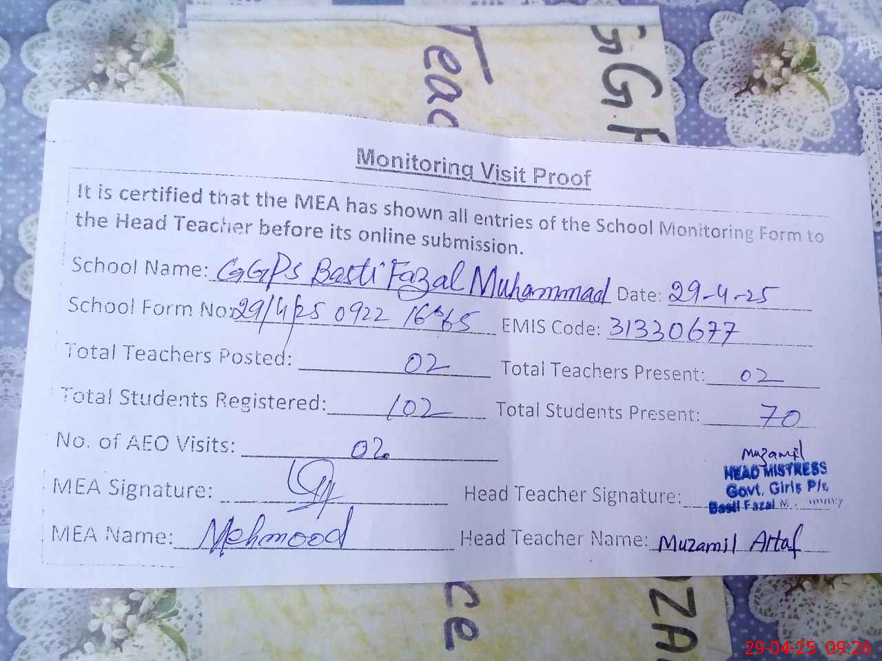 | Attendance Register | Head Teacher | MEA with School | Visit Proof |