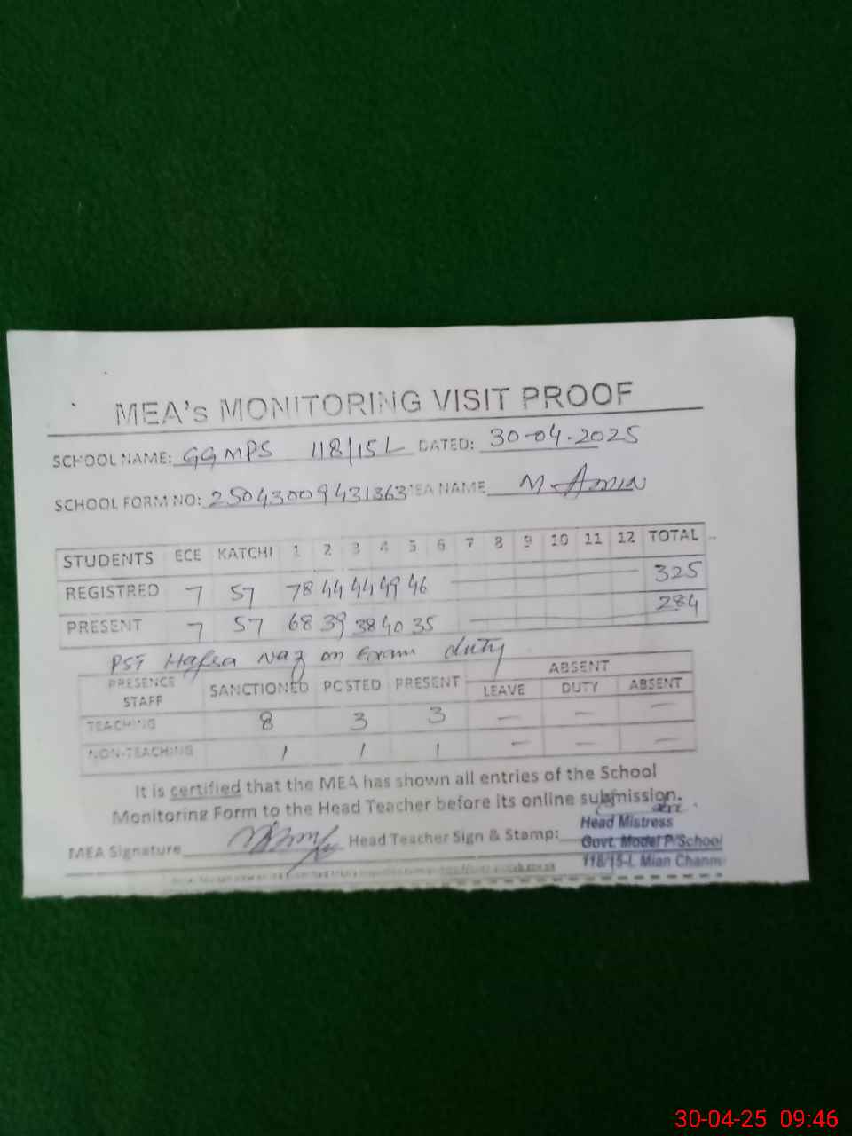 | Attendance Register | Head Teacher | MEA with School | Visit Proof |