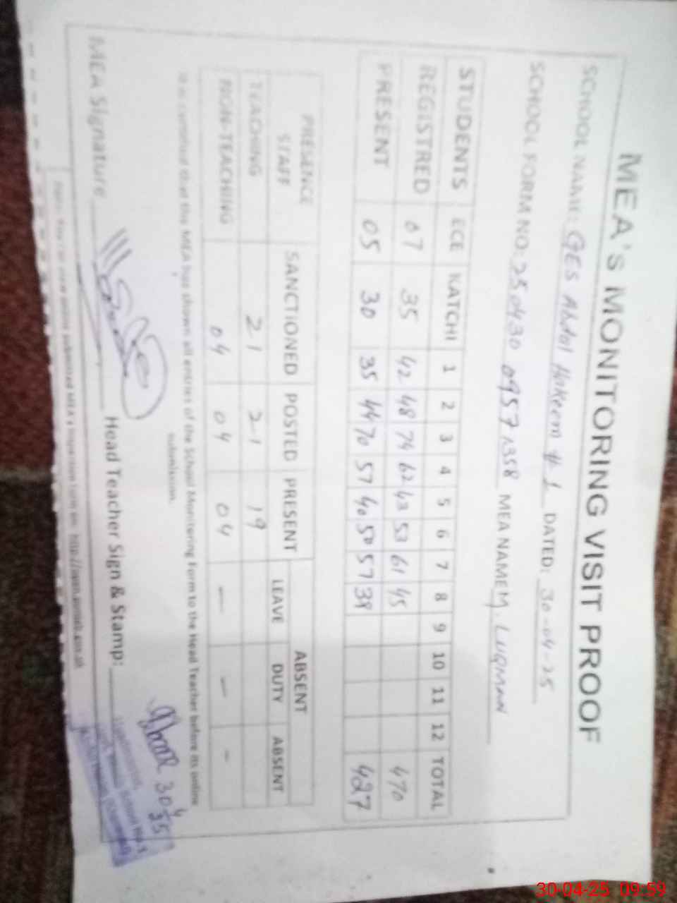 | Attendance Register | Head Teacher | MEA with School | Visit Proof |