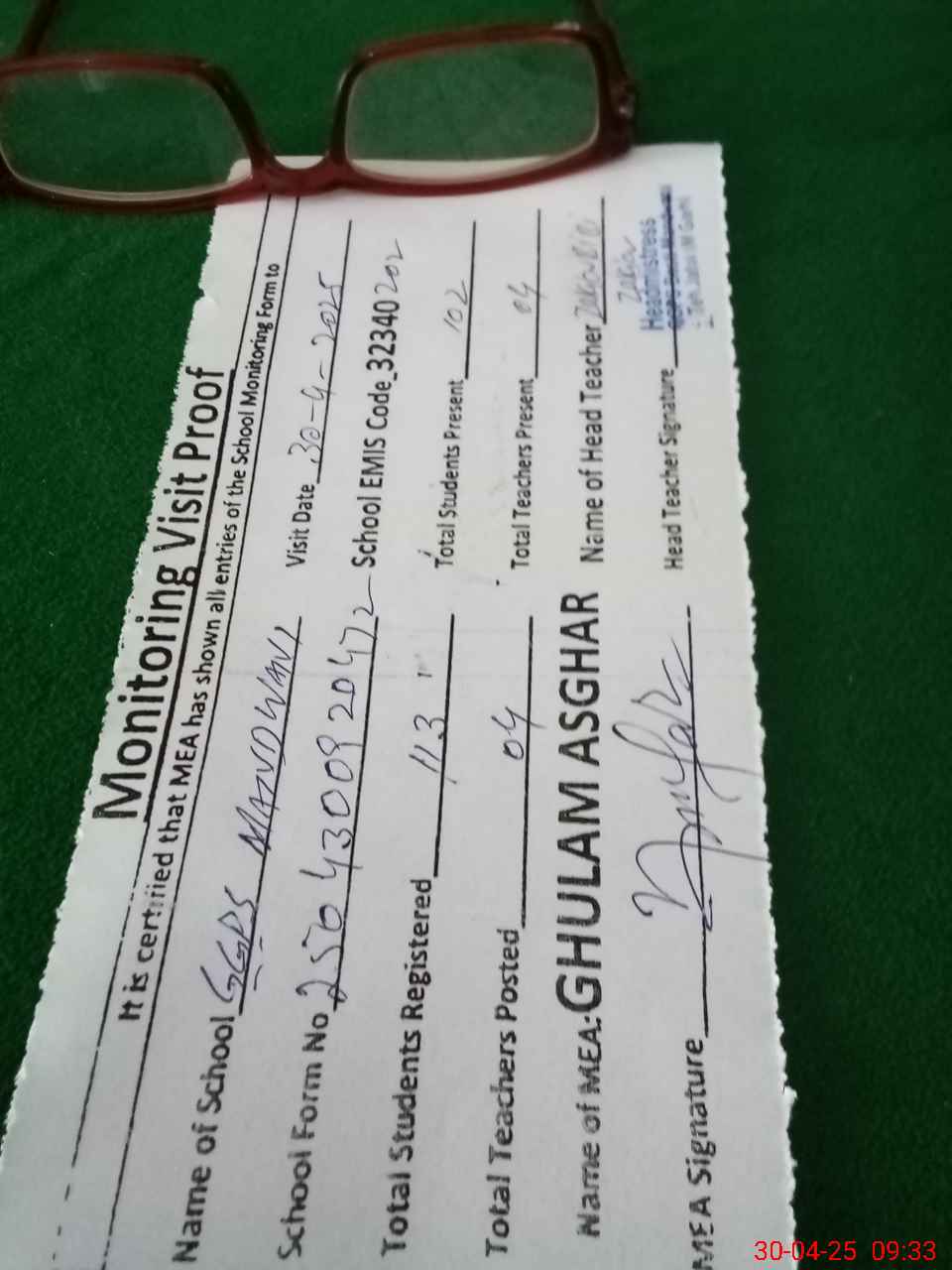 | Attendance Register | Head Teacher | MEA with School | Visit Proof |