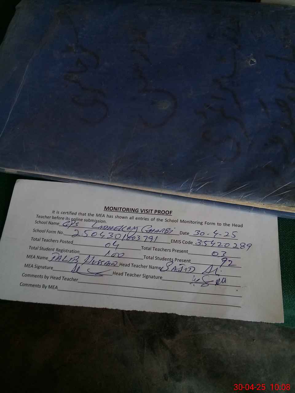 | Attendance Register | Head Teacher | MEA with School | Visit Proof |