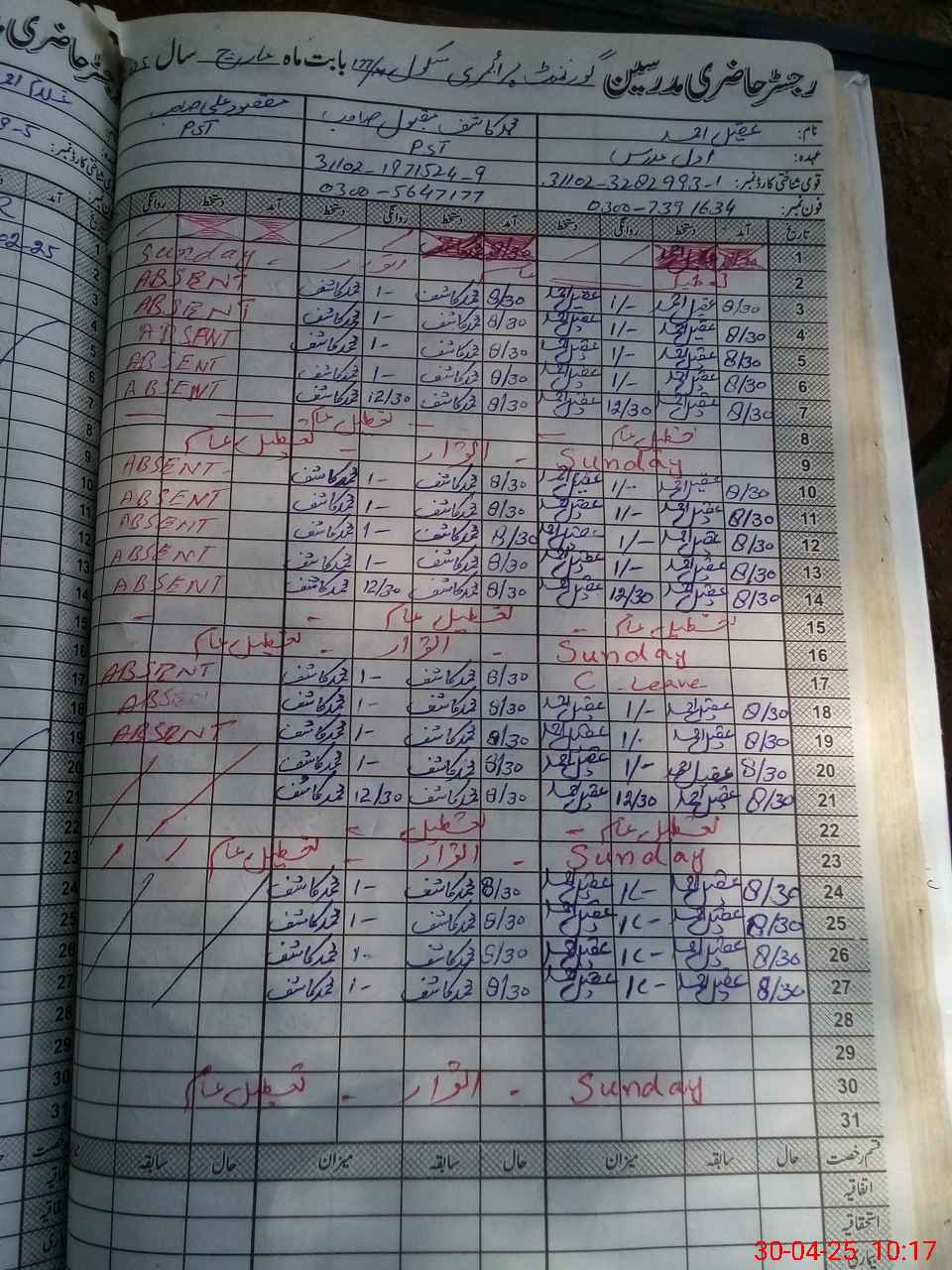 | Remarks (Use Separate Page if Required): TEACHER MAQSOOD AHMED PST ABSENT WITHOUT LEAVE LAST ONE YEAR BUT NOT ACTION TAKEN ANY AUTHORITY | |||||