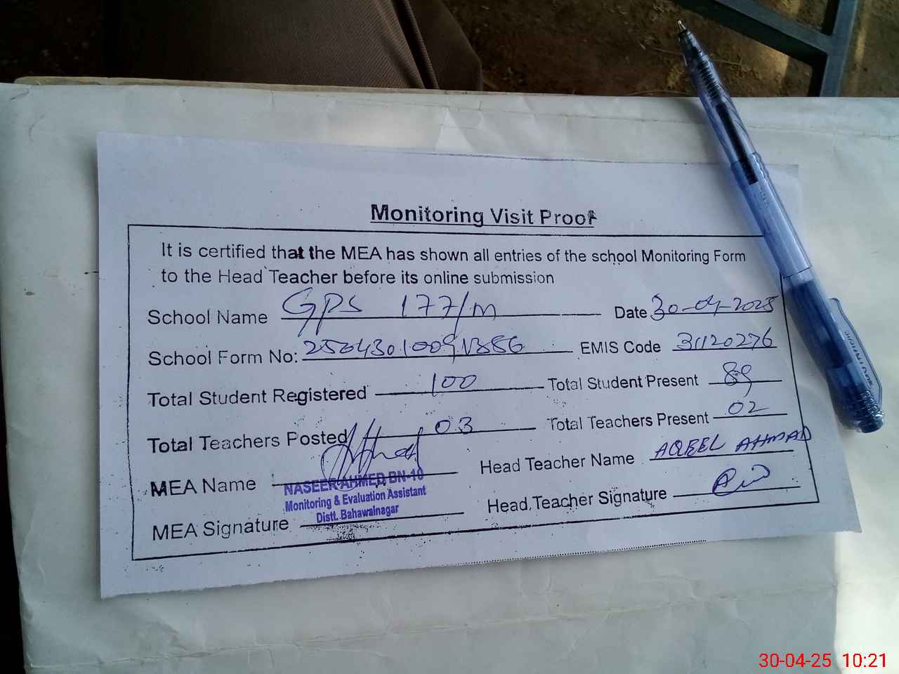 | EMIS Code: 31120276 | Name of School: GPS CHAK NO 177/M | |||