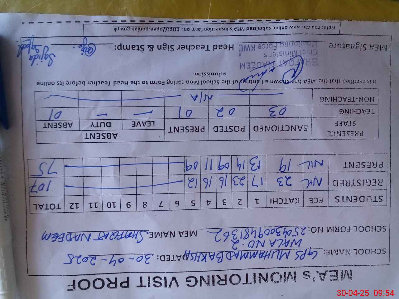 | Attendance Register | Head Teacher | MEA with School | Visit Proof |