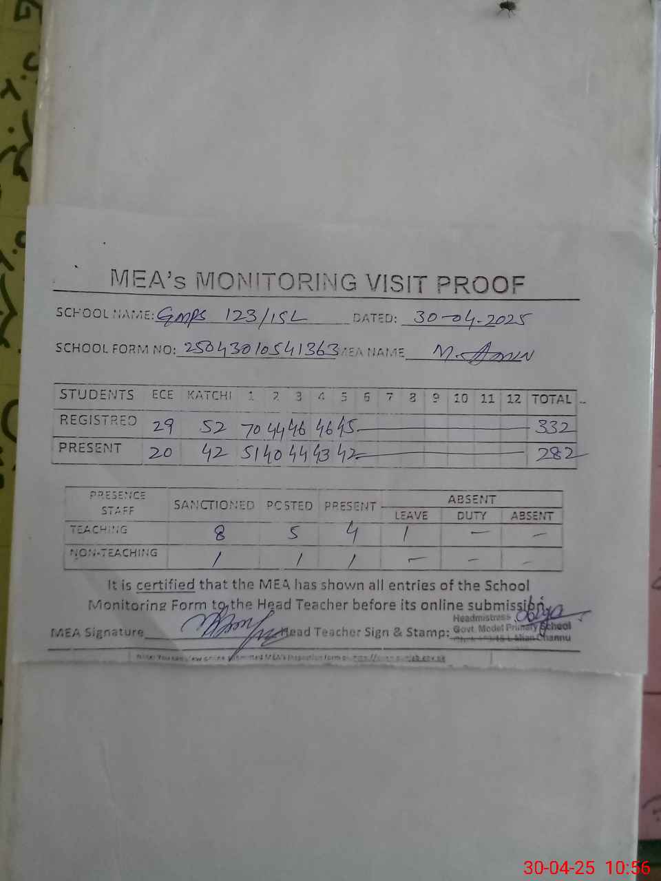 | Attendance Register | Head Teacher | MEA with School | Visit Proof |