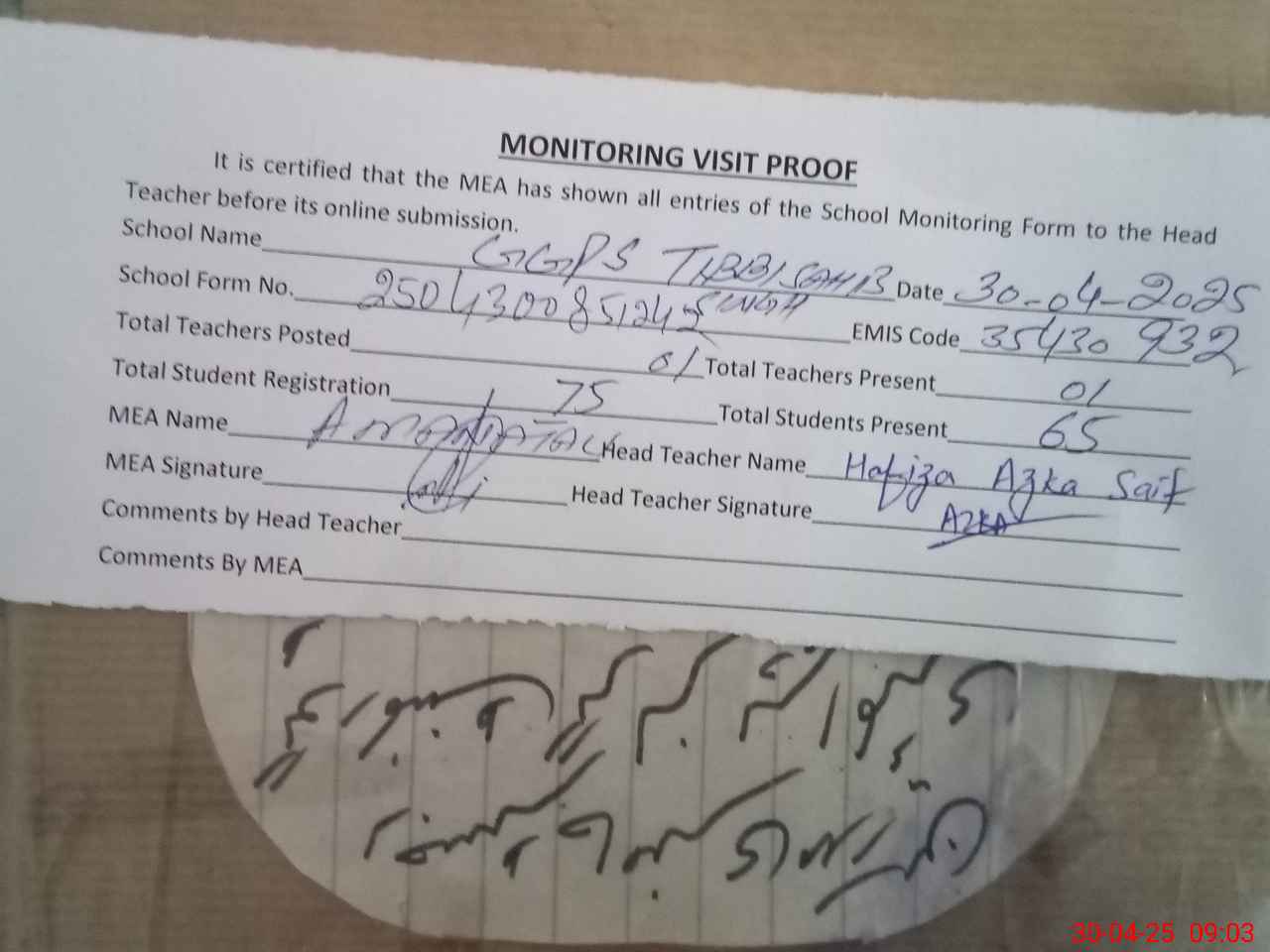 | Attendance Register | Head Teacher | MEA with School | Visit Proof |