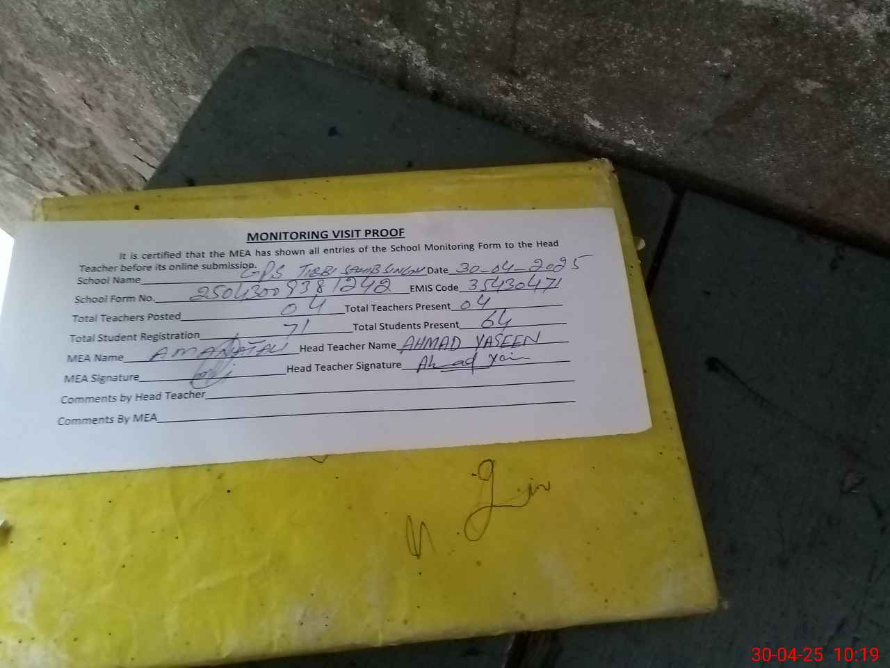 | Attendance Register | Head Teacher | MEA with School | Visit Proof |