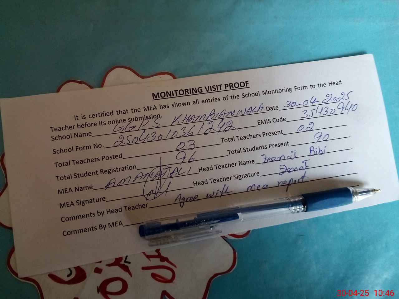 | Attendance Register | Head Teacher | MEA with School | Visit Proof |