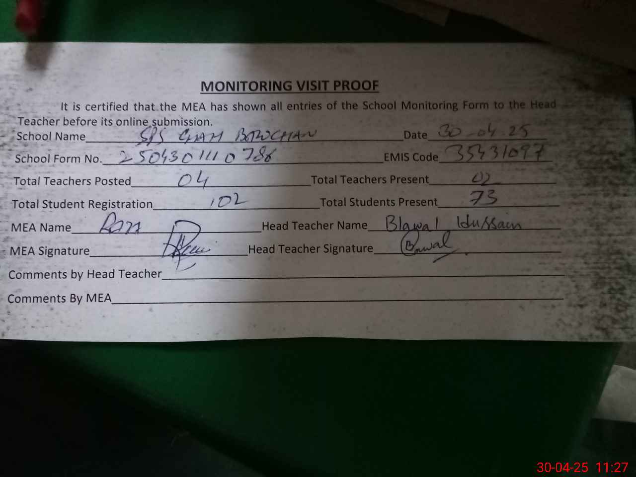 | Attendance Register | Head Teacher | MEA with School | Visit Proof |