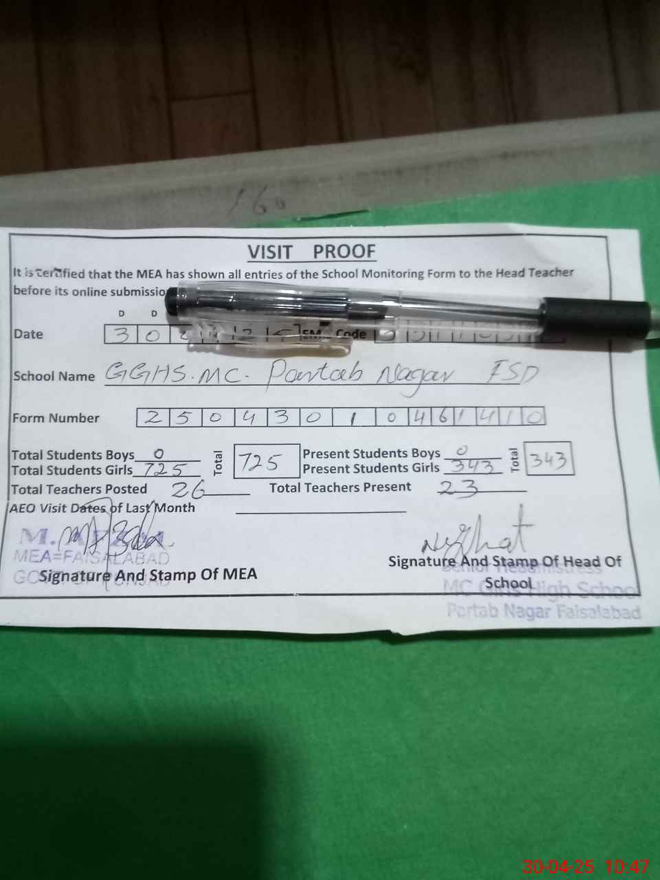 | Attendance Register | Head Teacher | MEA with School | Visit Proof |