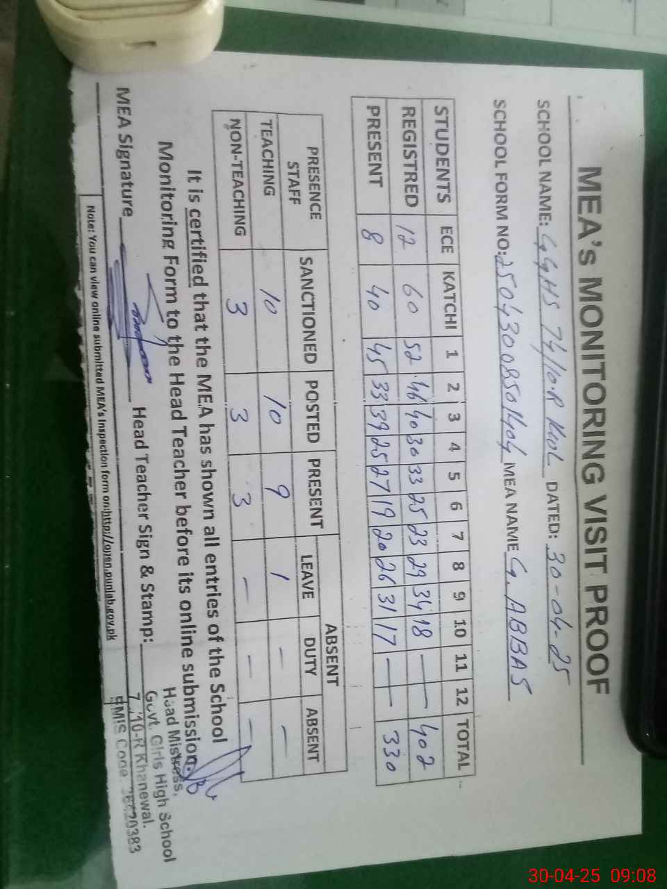 | Attendance Register | Head Teacher | MEA with School | Visit Proof |