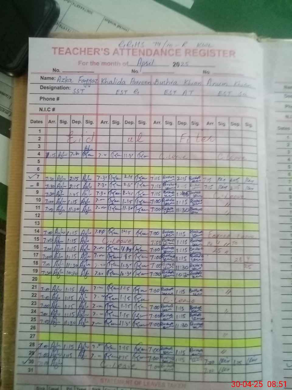| Name: Az**** Fa**** Designation: (School Headmaster's/Headmistress's) SST Phone/Cell Number: 03**** |