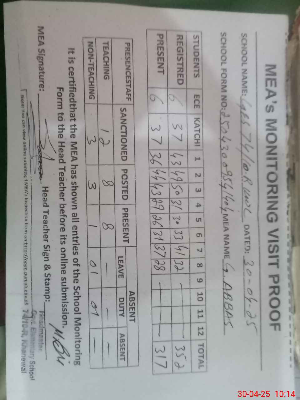 | Attendance Register | Head Teacher | MEA with School | Visit Proof |