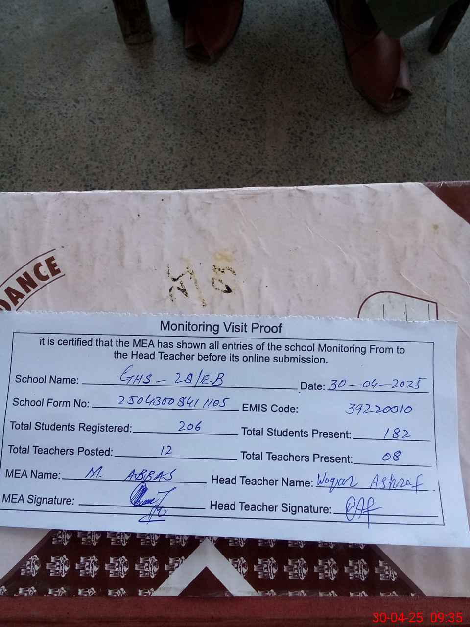 | Attendance Register | Head Teacher | MEA with School | Visit Proof |