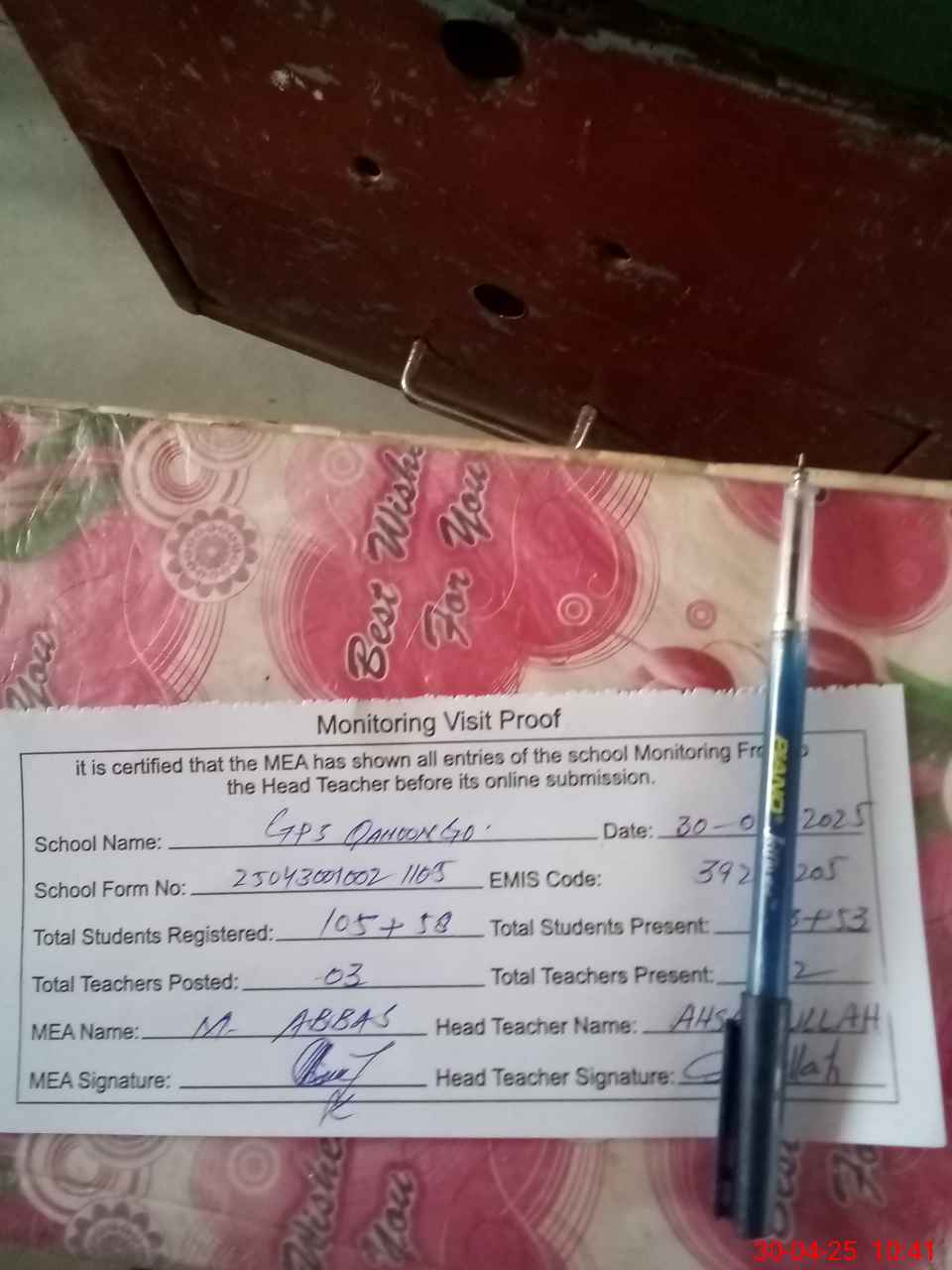 | Attendance Register | Head Teacher | MEA with School | Visit Proof |