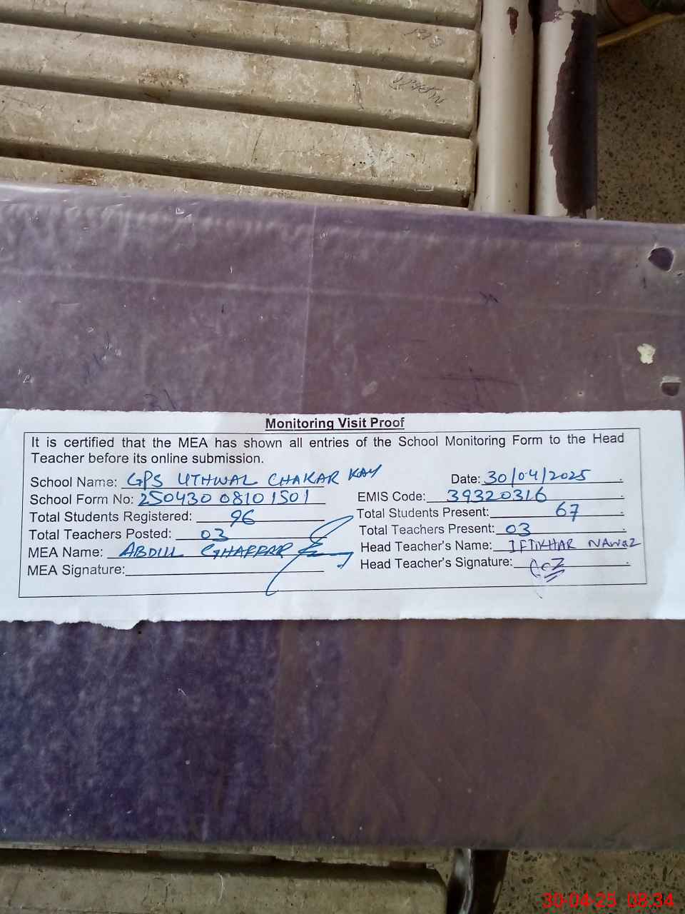| Attendance Register | Head Teacher | MEA with School | Visit Proof |