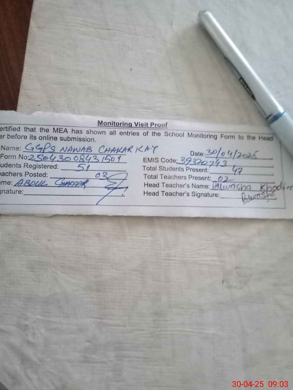 | Attendance Register | Head Teacher | MEA with School | Visit Proof |