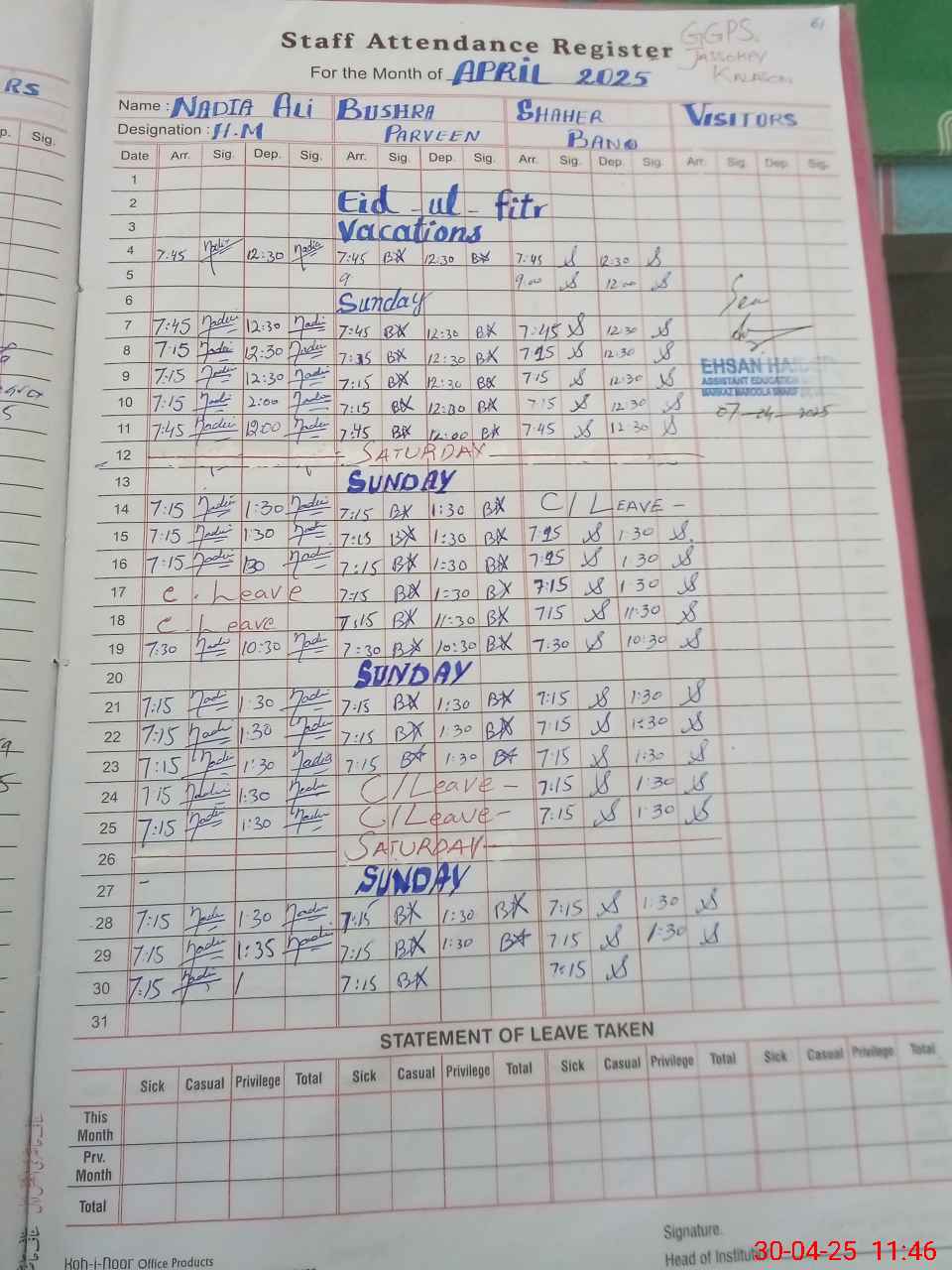 | Attendance Register | Head Teacher | MEA with School | Visit Proof |