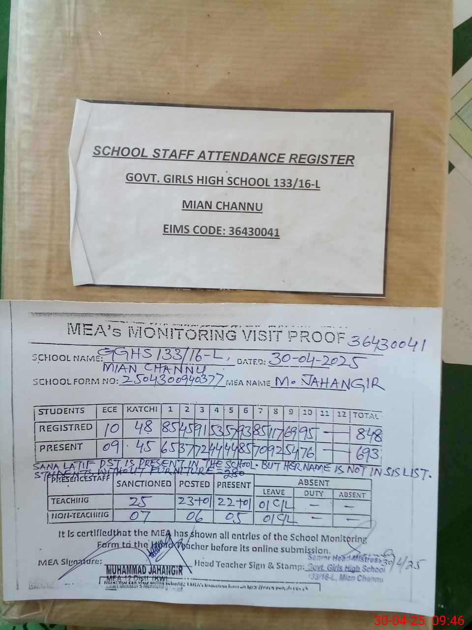 | Attendance Register | Head Teacher | MEA with School | Visit Proof |