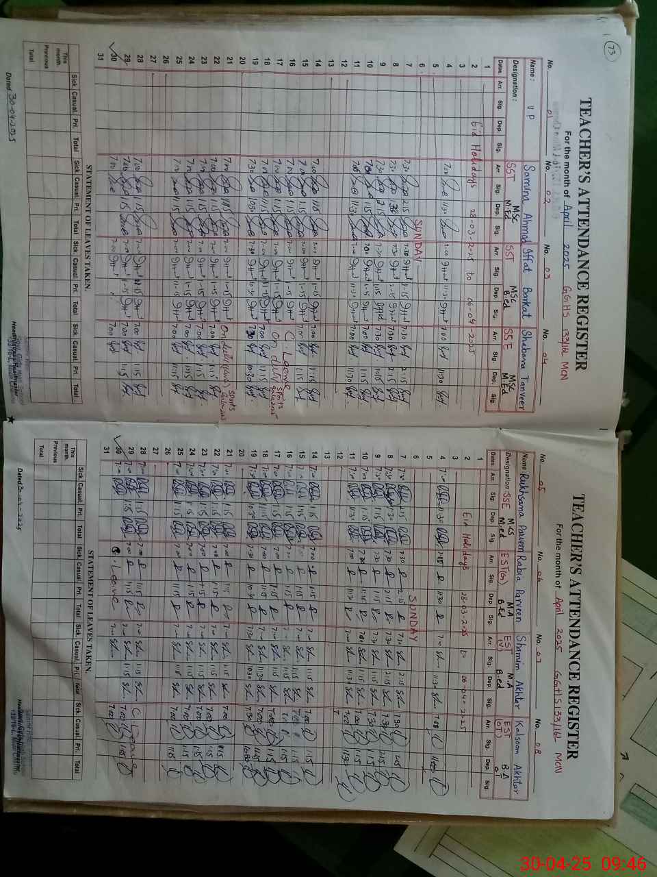 | Remarks (Use Separate Page if Required): SANA LATIF PST IS PRESENT IN THE SCHOOL TODAY BUT HER NAME IS NOT IN SIS LIST ONE TOILET FOUND BLOCKED AND NON FUNCTIONAL RANDOM CLASS FIVE IS NOW IN CLASS NINE | |||||