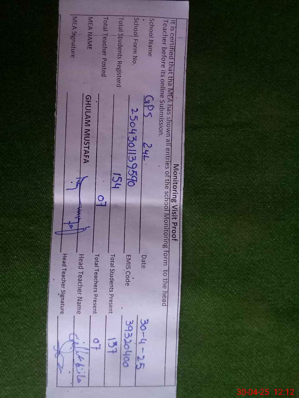 | Attendance Register | Head Teacher | MEA with School | Visit Proof |