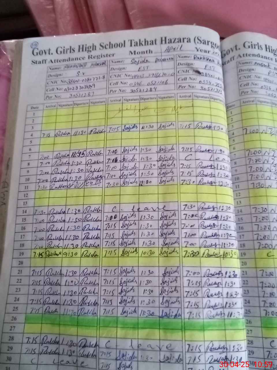 | CNIC | Full Name | Designation | R/C | Absence During Last Calender Month |