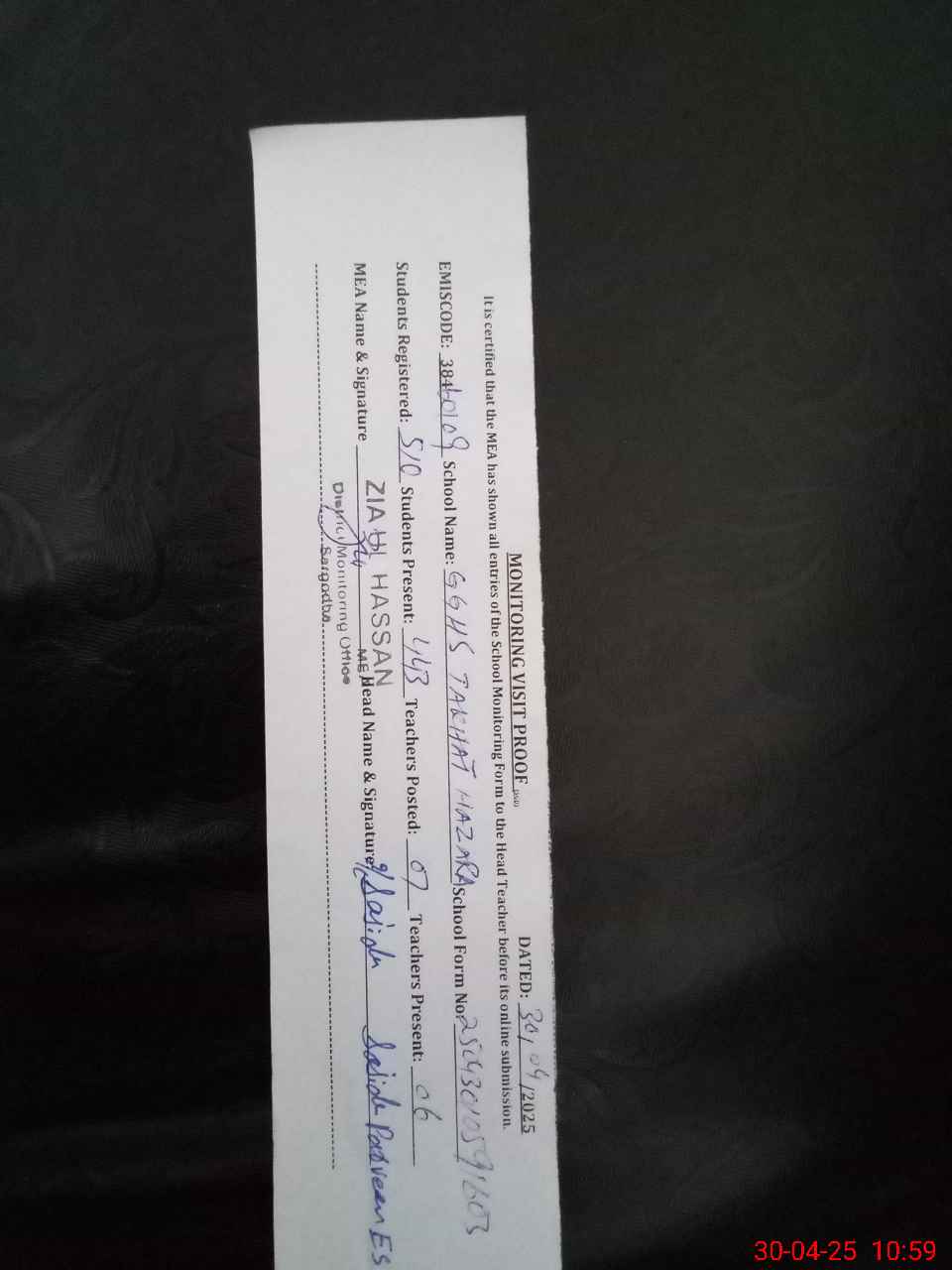 | Certified that this School was Inspected by the Undersigned MEA/DMO Today and the Information Stated Above is as Per Record. | |||||