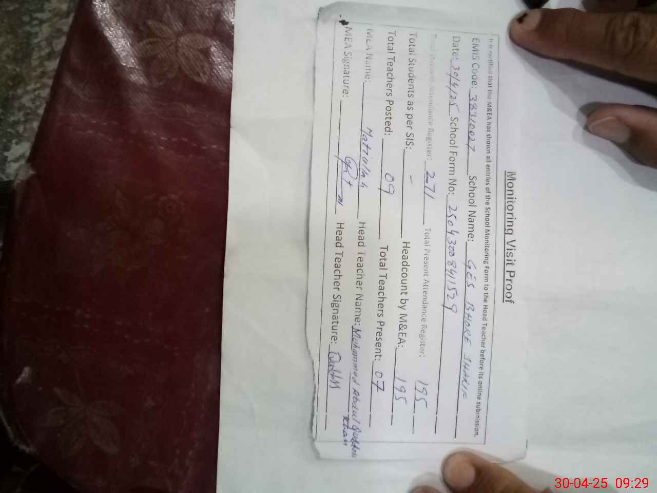 | Attendance Register | Head Teacher | MEA with School | Visit Proof |