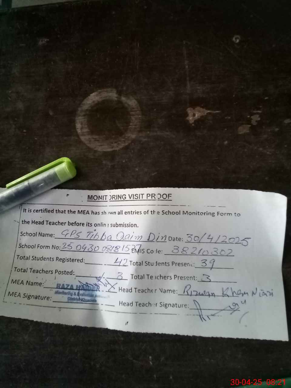 | Attendance Register | Head Teacher | MEA with School | Visit Proof |