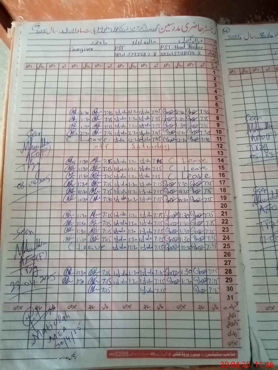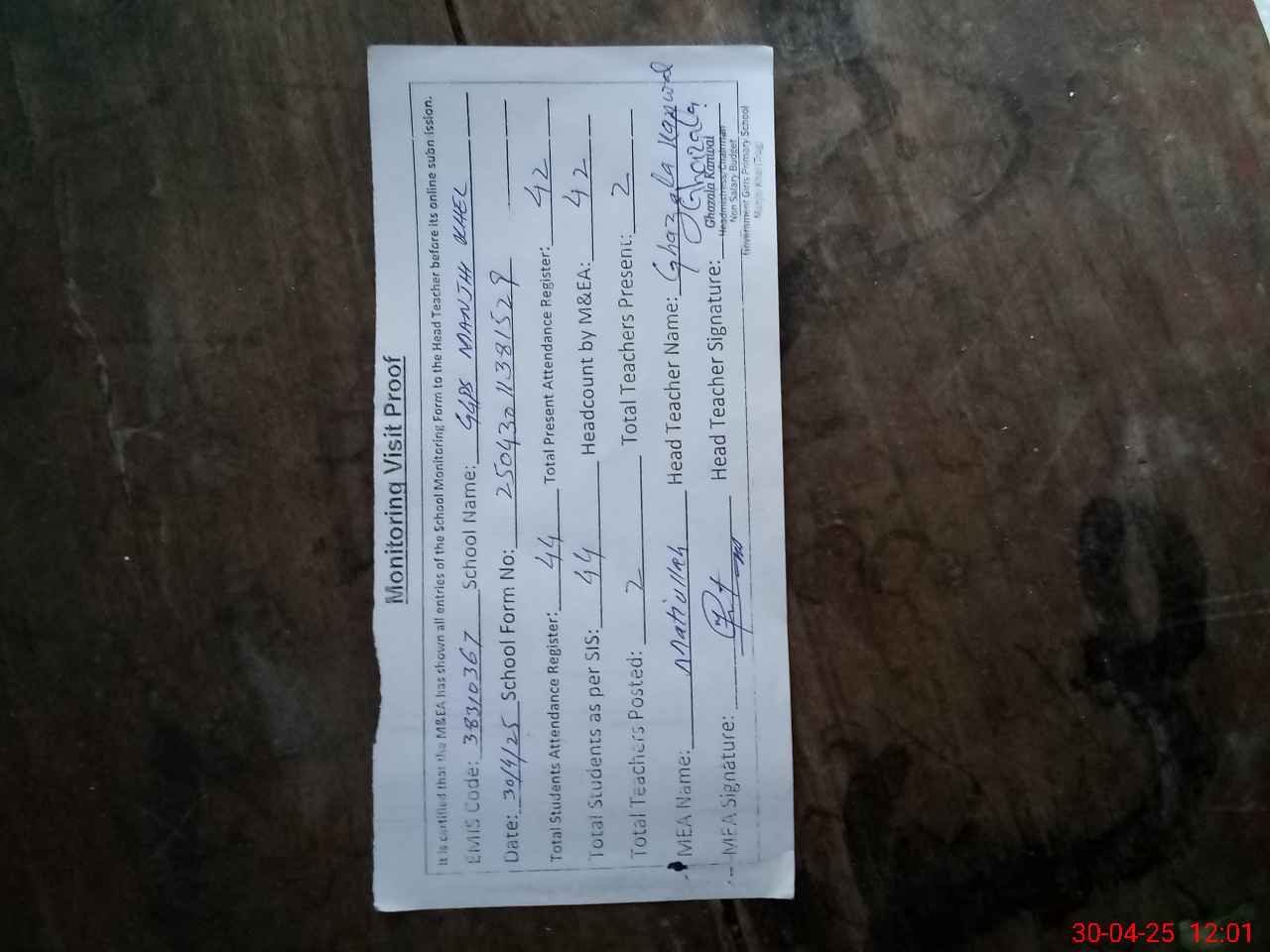 | Attendance Register | Head Teacher | MEA with School | Visit Proof |