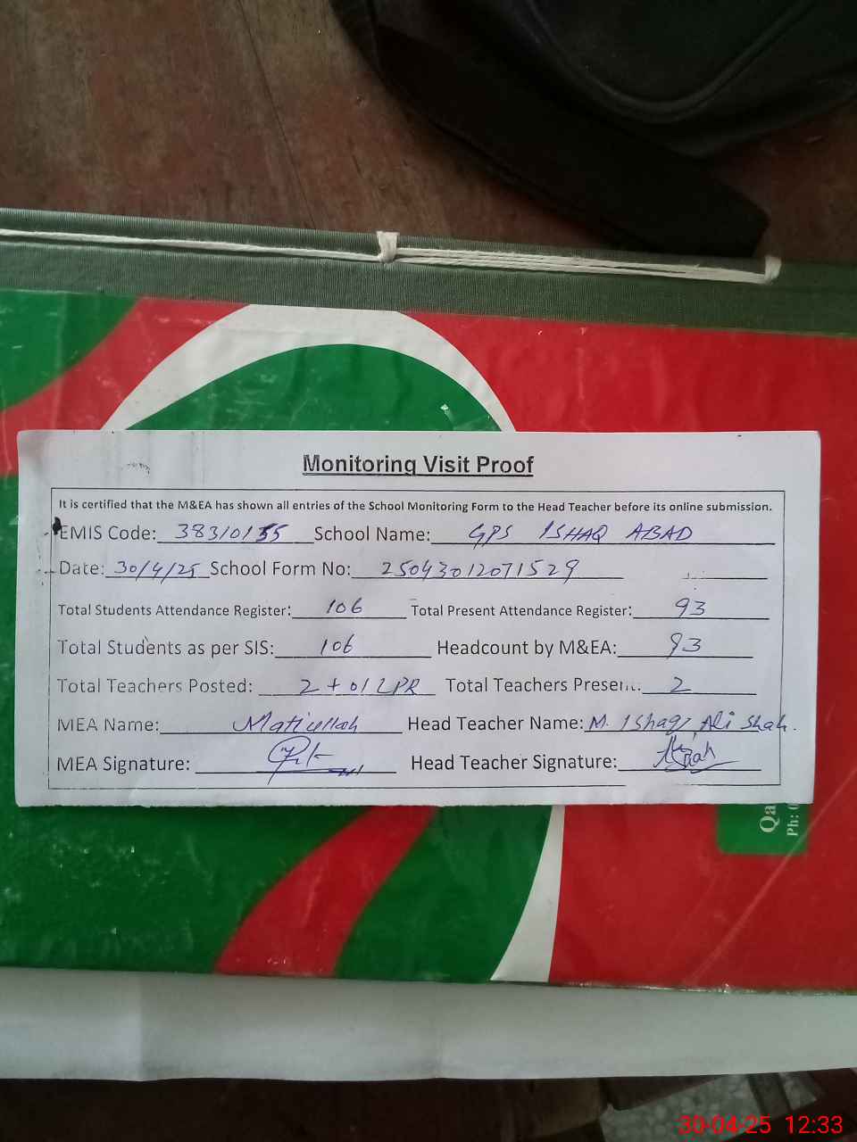| EMIS Code: 38310155 | Name of School: GPS ISHAQ ABAD | |||