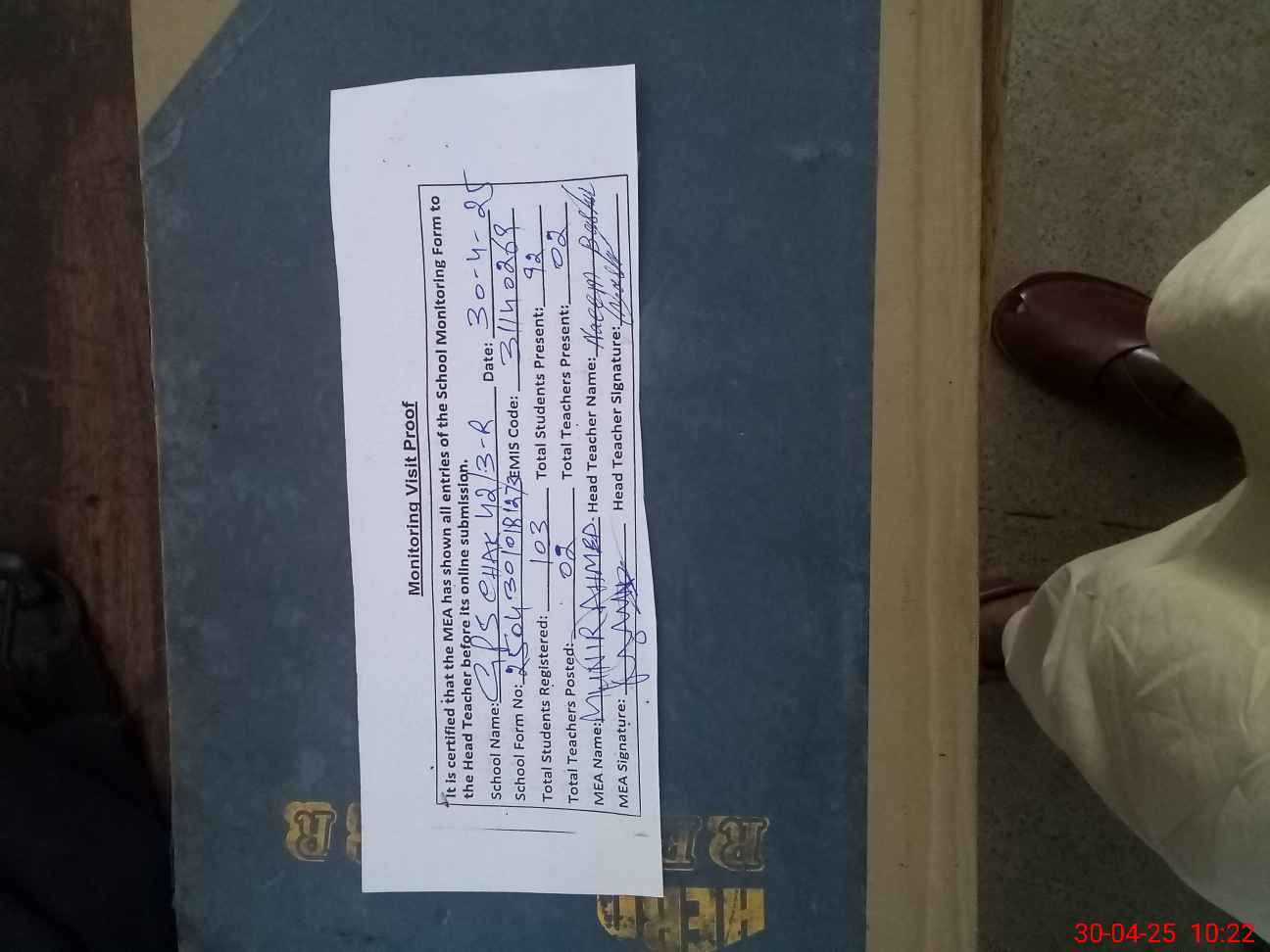 | Attendance Register | Head Teacher | MEA with School | Visit Proof |