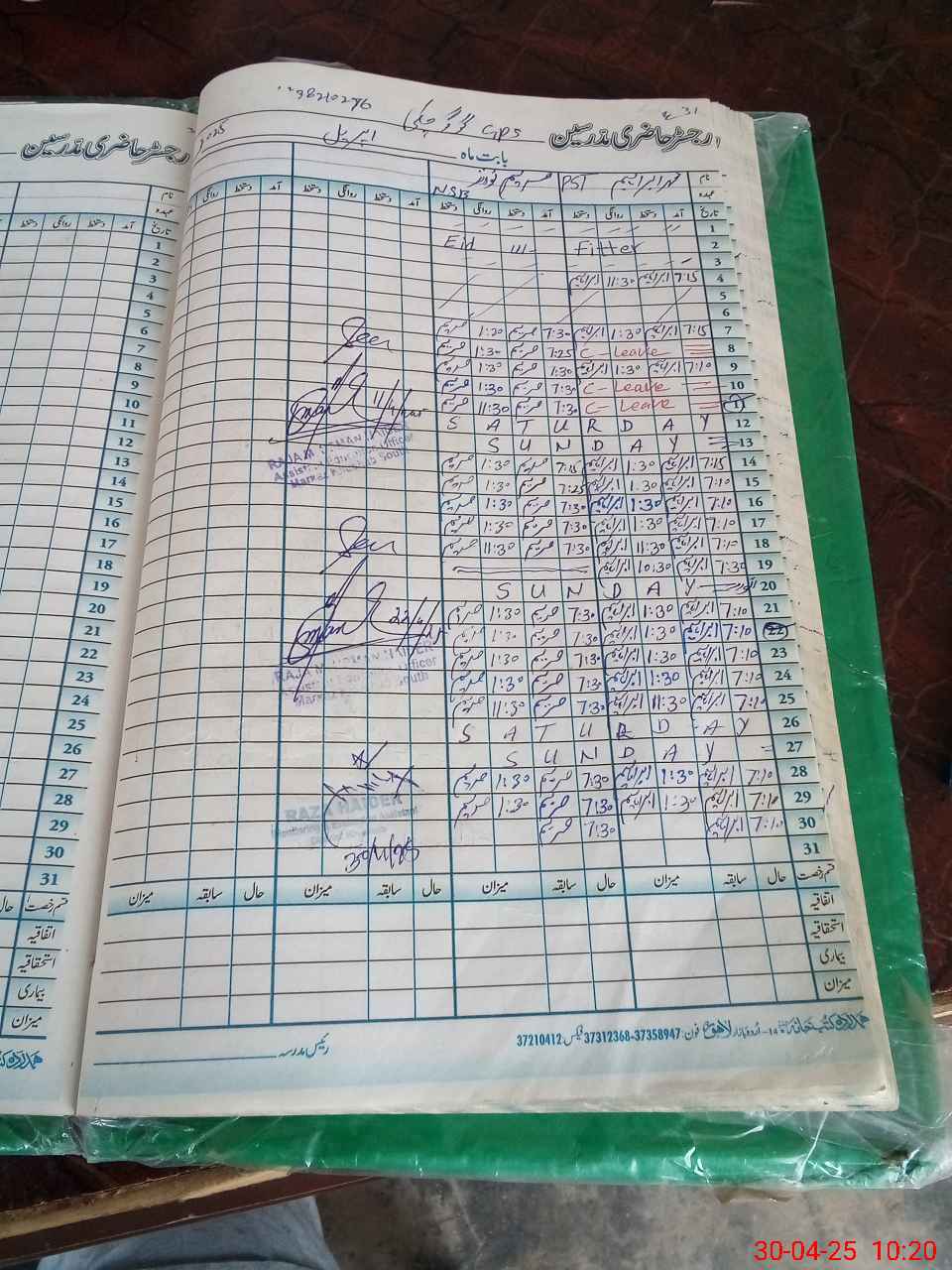| CNIC | Full Name | Designation | R/C | Absence During Last Calender Month |
