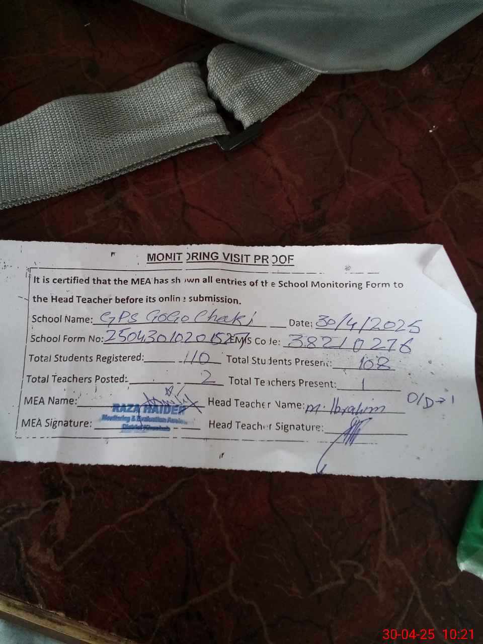 | Attendance Register | Head Teacher | MEA with School | Visit Proof |