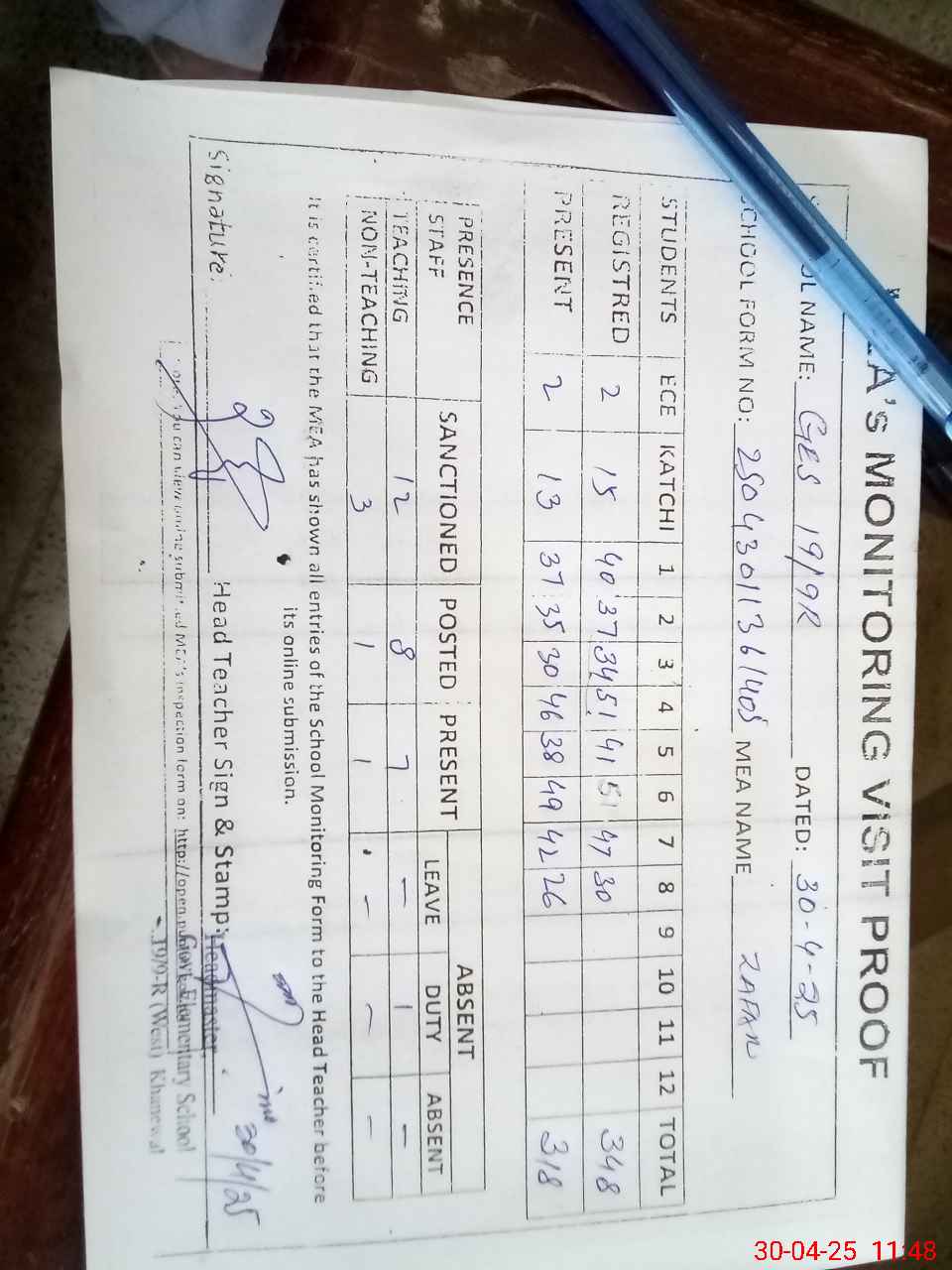 | Attendance Register | Head Teacher | MEA with School | Visit Proof |